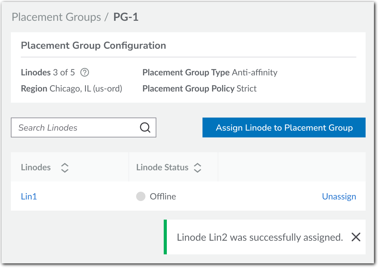 Setting up a placement group is a simple process using Cloud Manager, the Linode API, or our CLI. Create a new group in a supported region and add new or existing compute instances from that region to your group. When assigning compute instances to the placement group, we physically place them, based on your desired model.